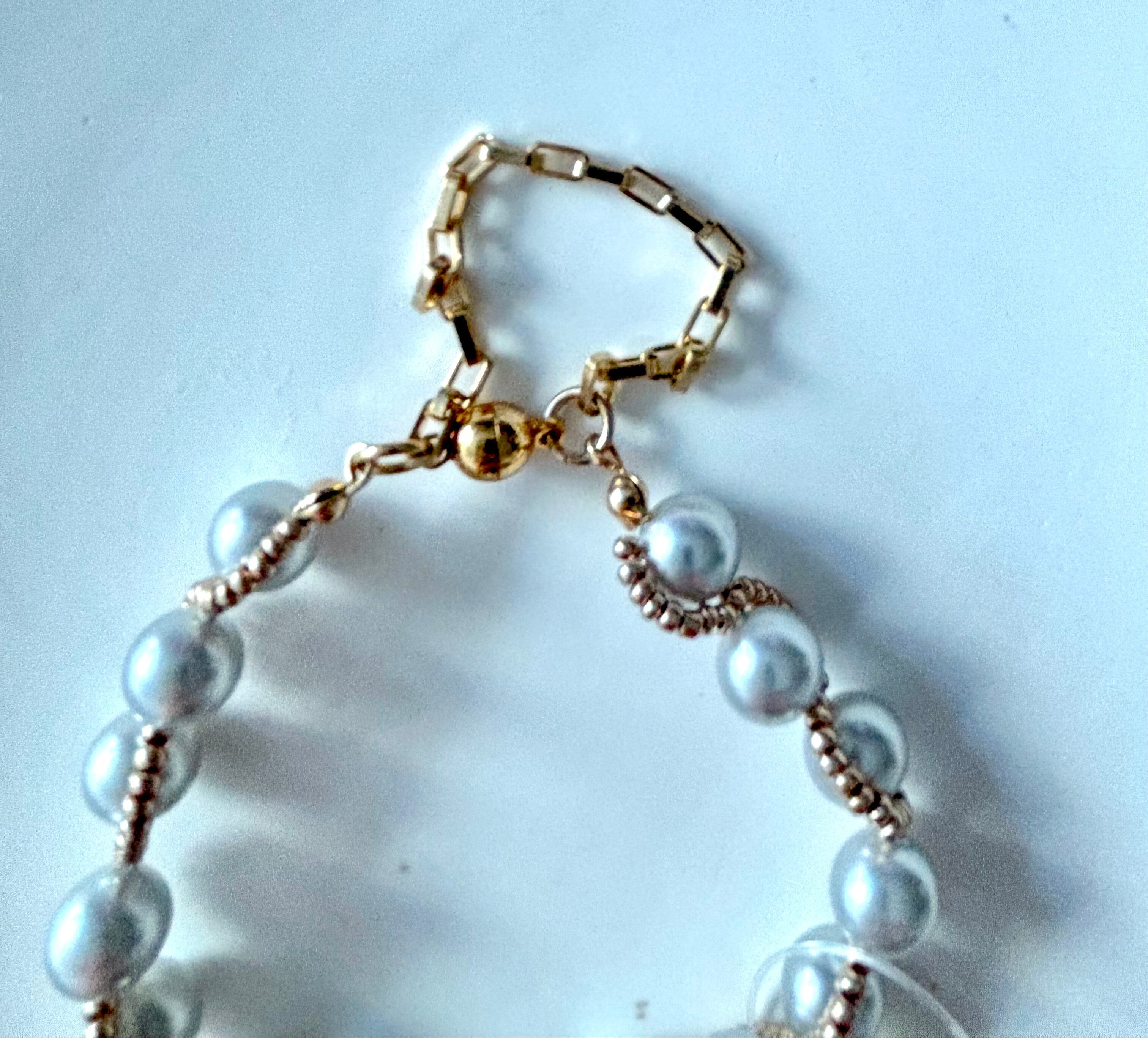 Ciell's bracelet of silver colored pearls combined with small gold beads.