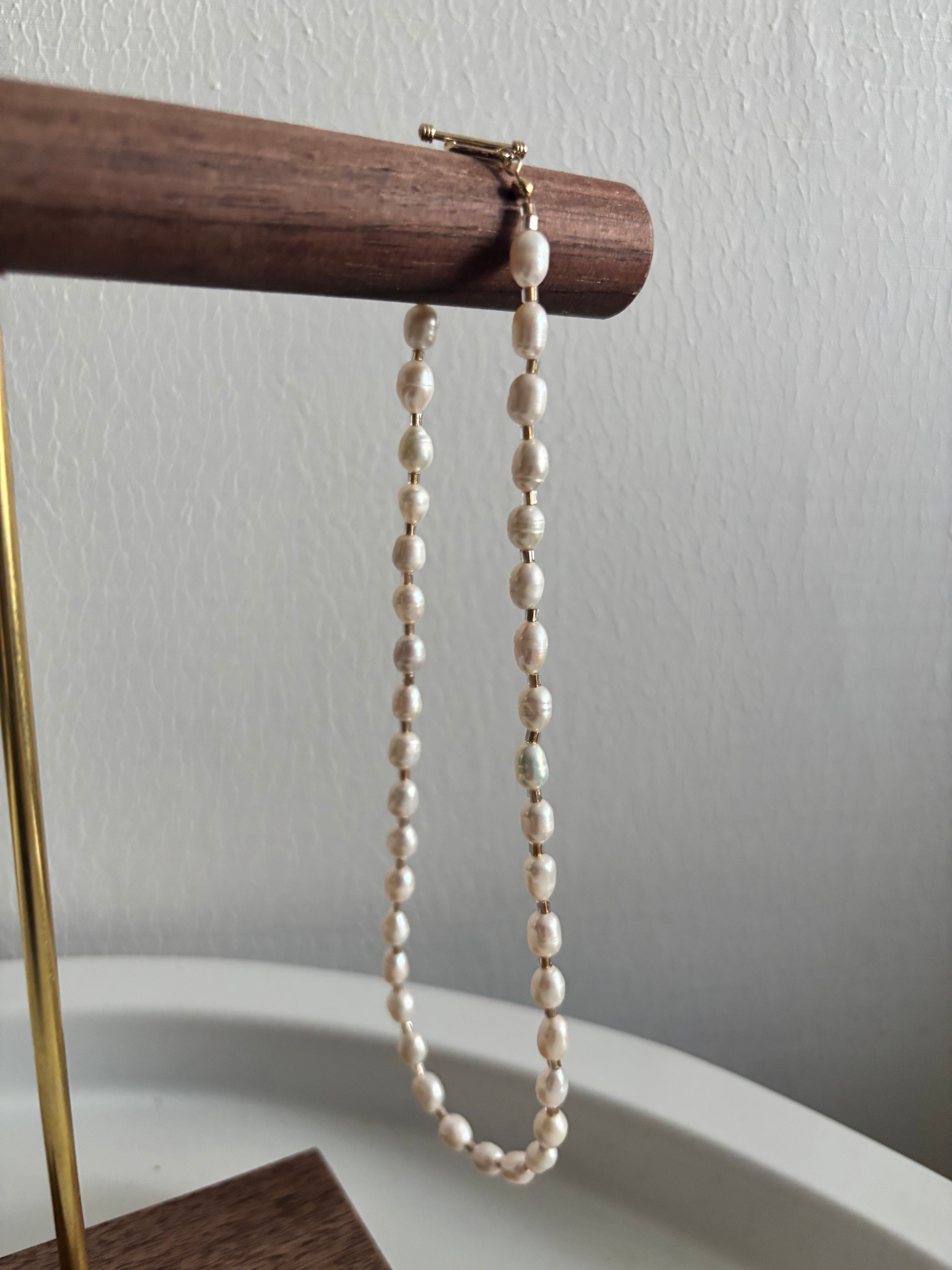 The combination of freshwater pearls and beige glass beads is simple yet elegant.