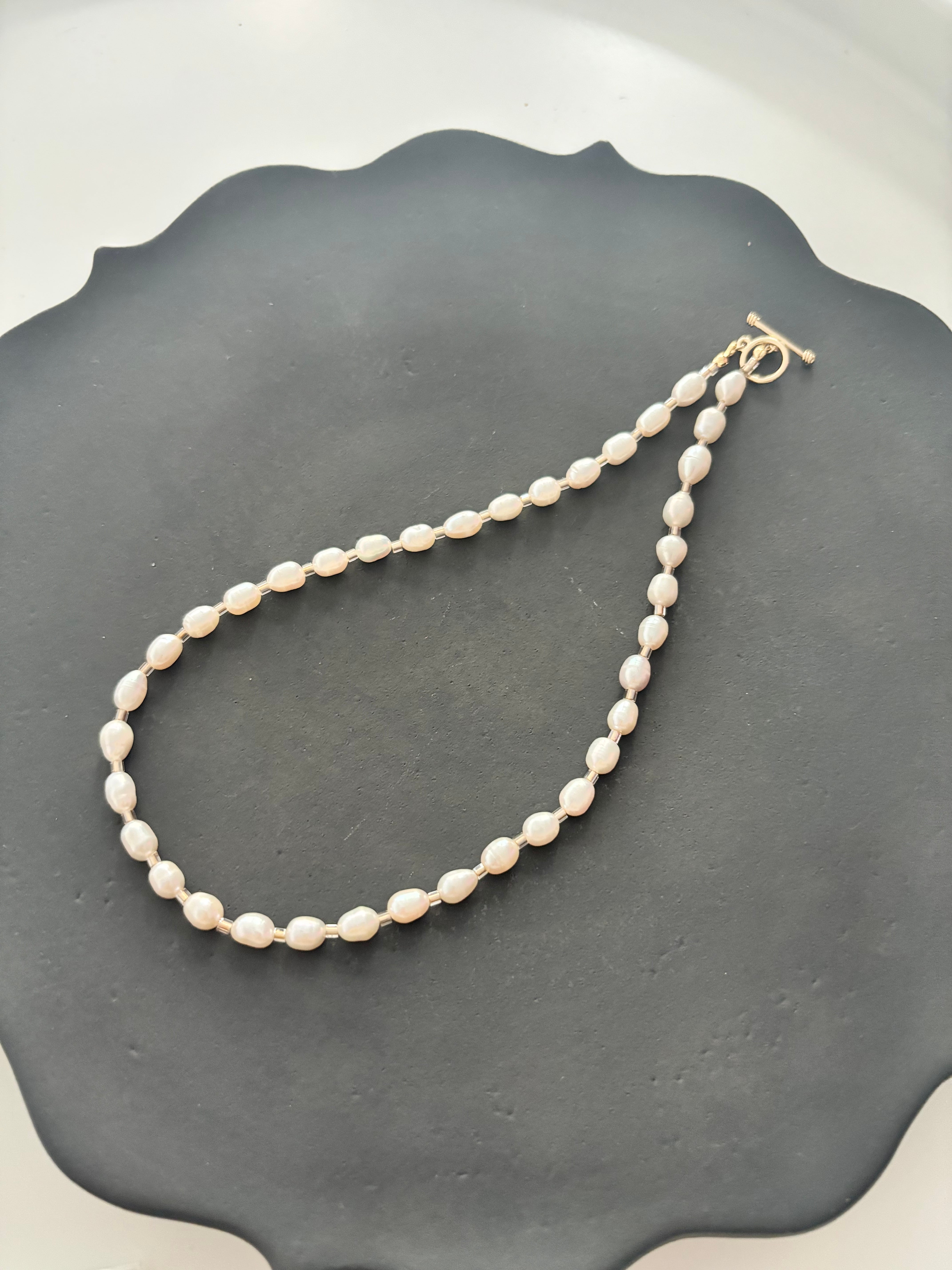 淡水パールとベージュのガラスビーズを組み合わせたシンプルでエレガントなショートネックレス。普段の装いにアクセントを加えてくれるアイテムです。