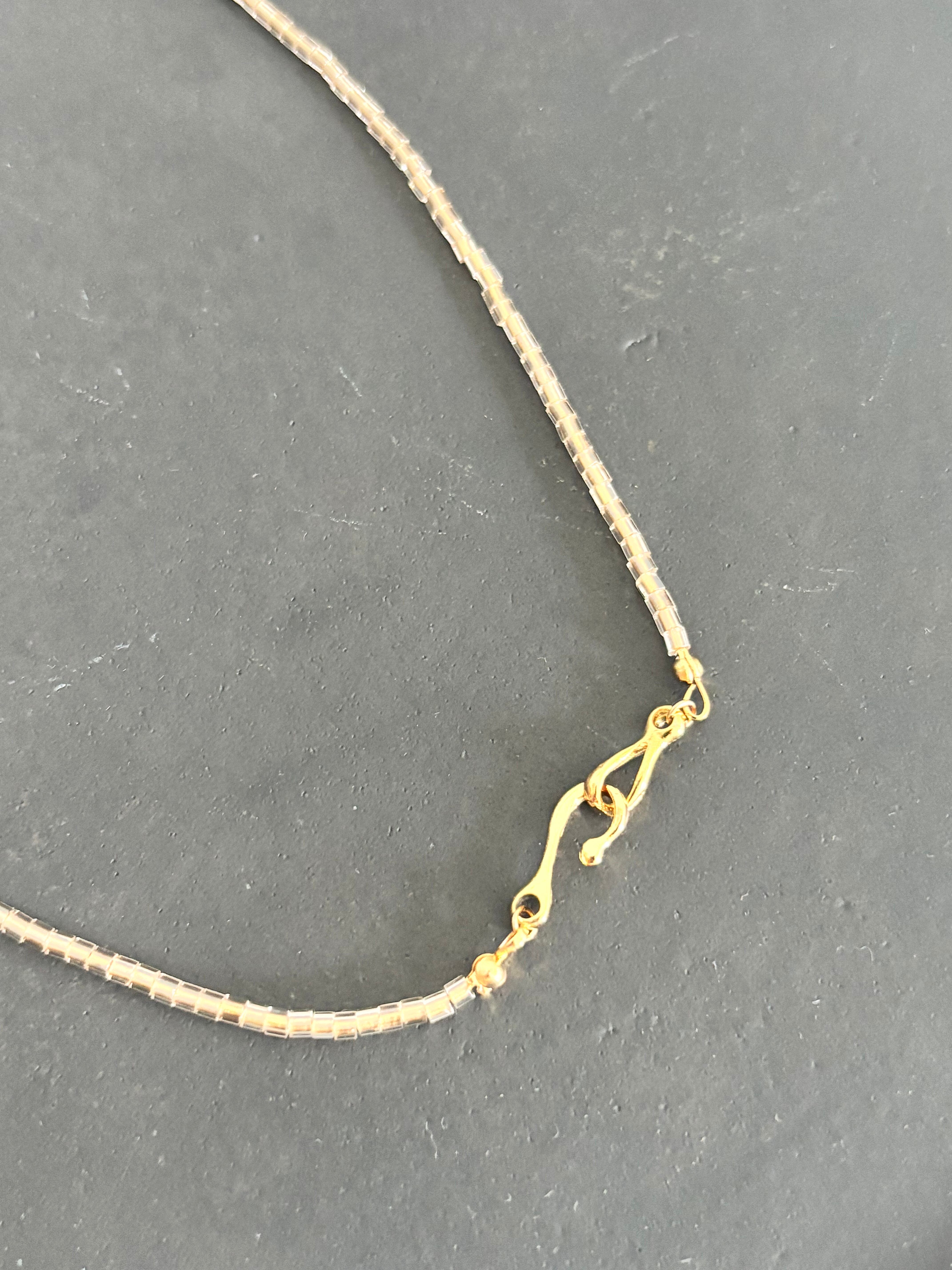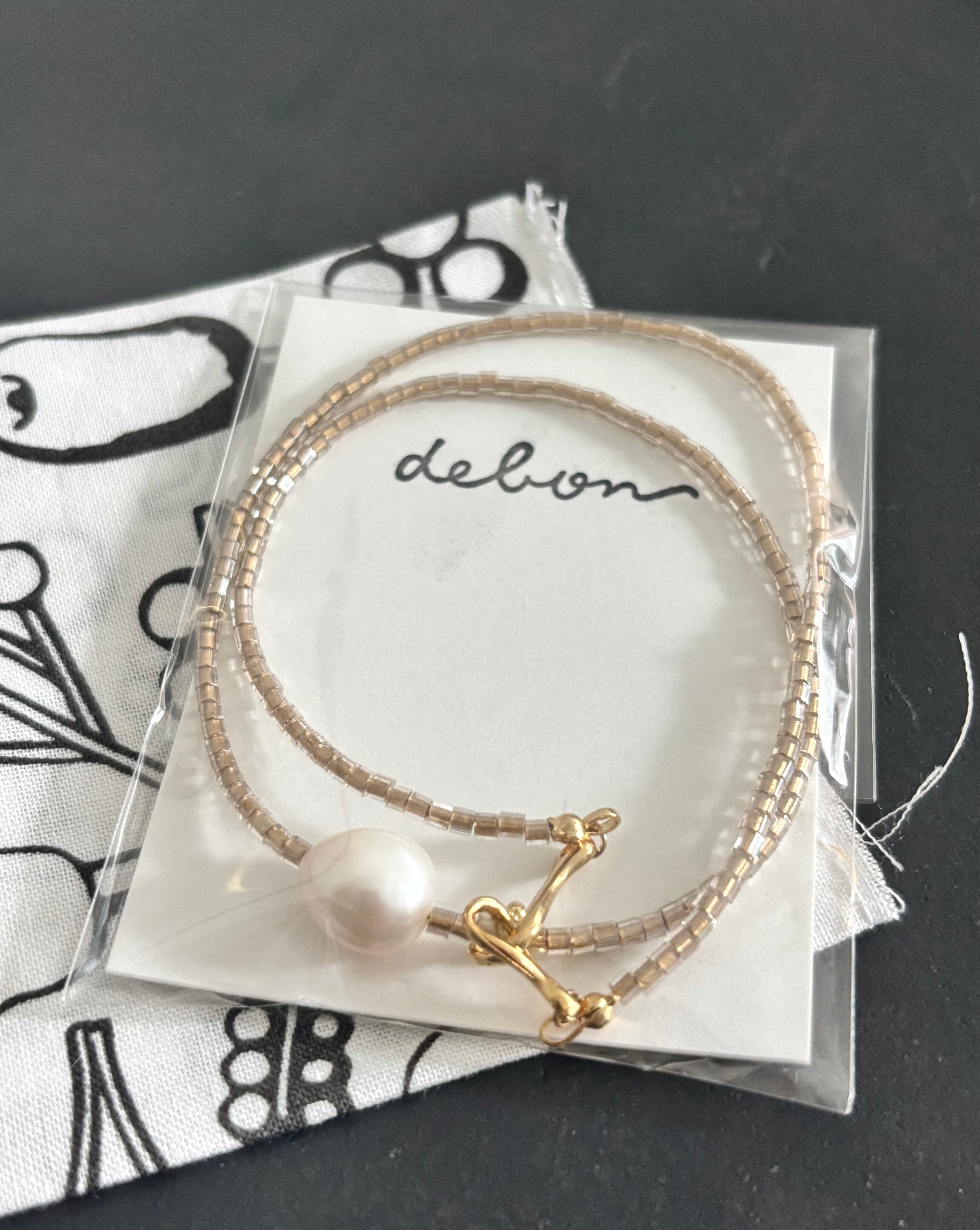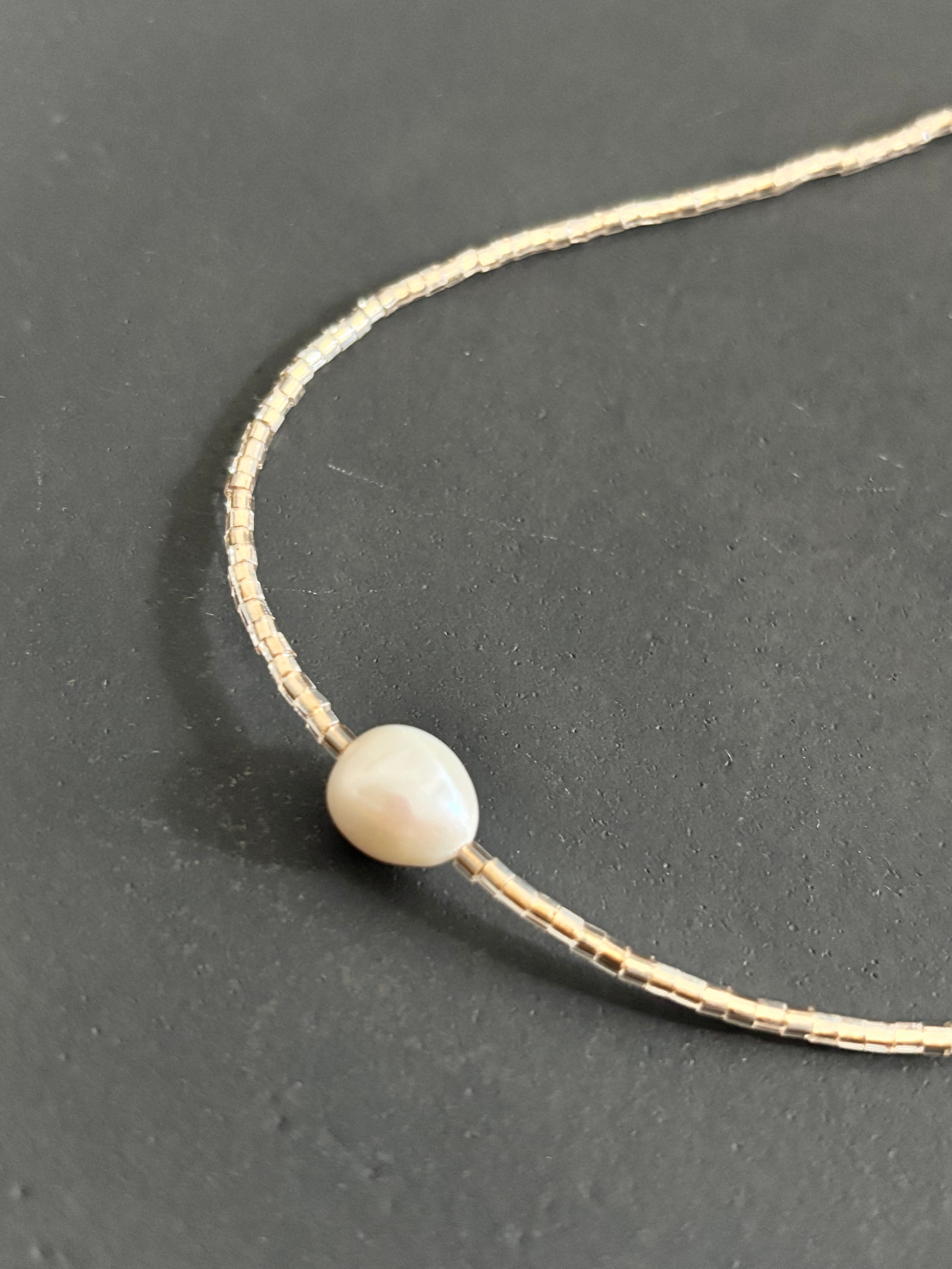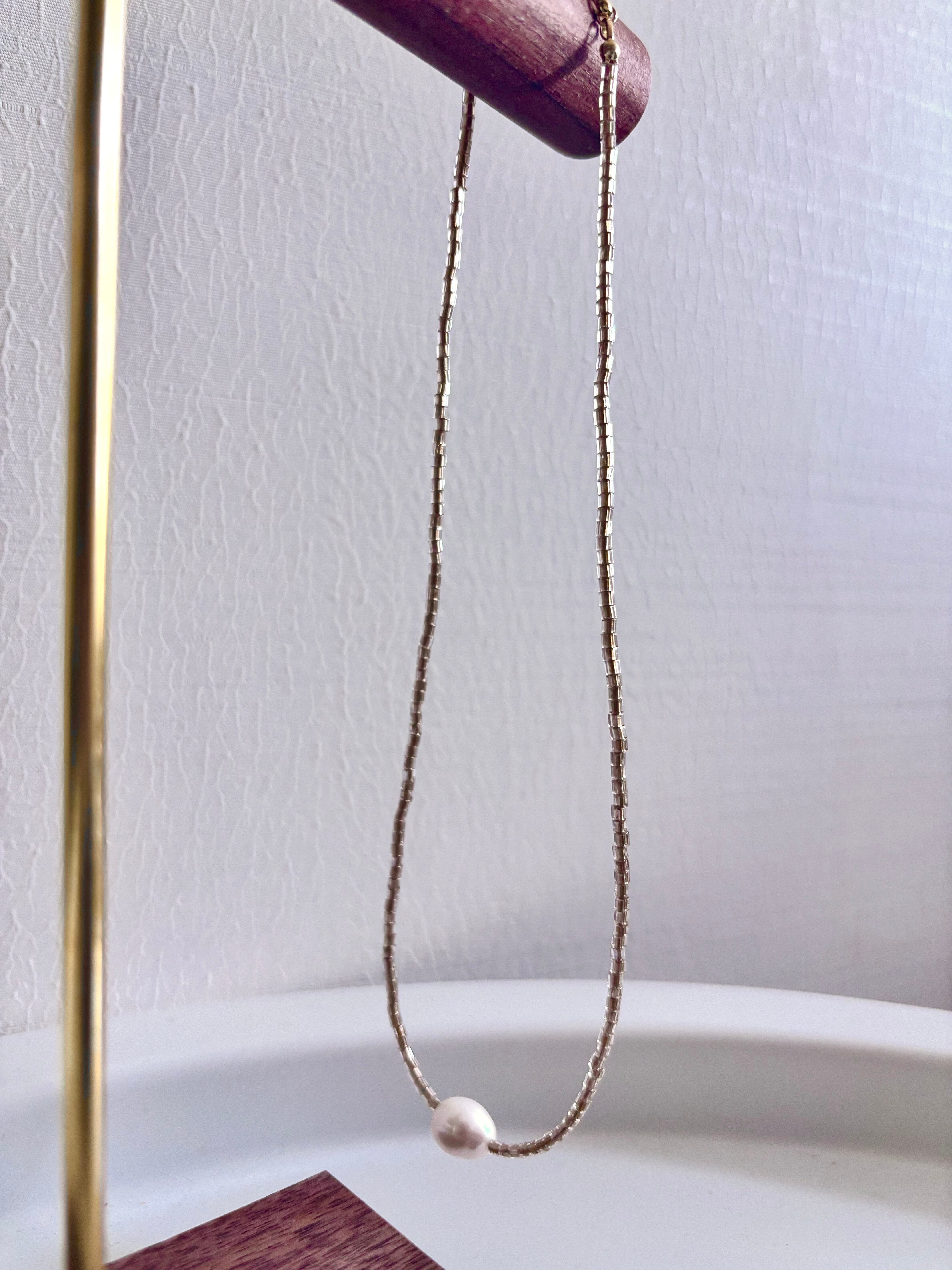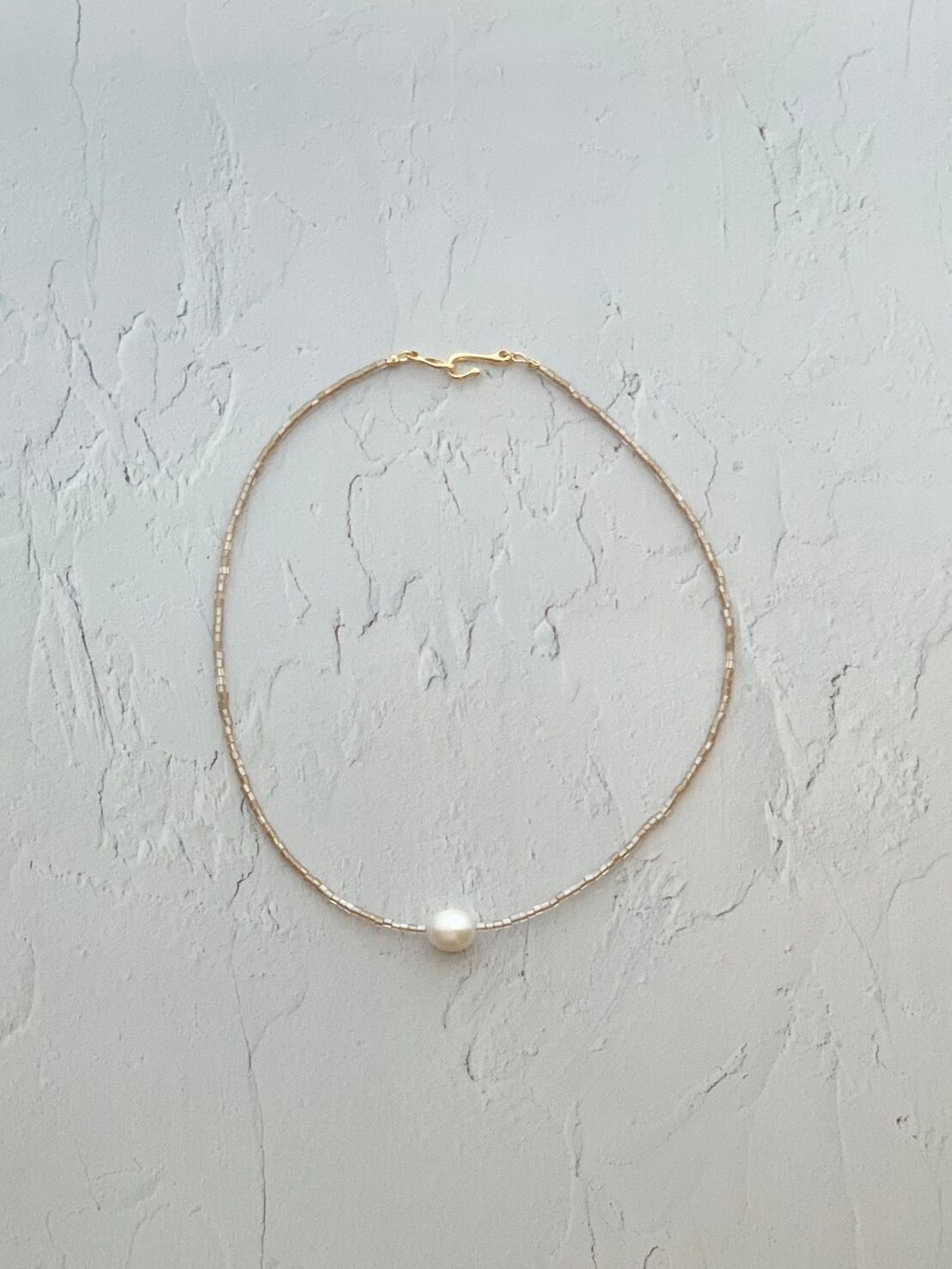 ベージュのガラスビーズと大ぶりの淡水パールを組み合わせたシンプルでスタイリッシュなショートネックレス。普段の装いにアクセントを加えてくれるアイテムです。