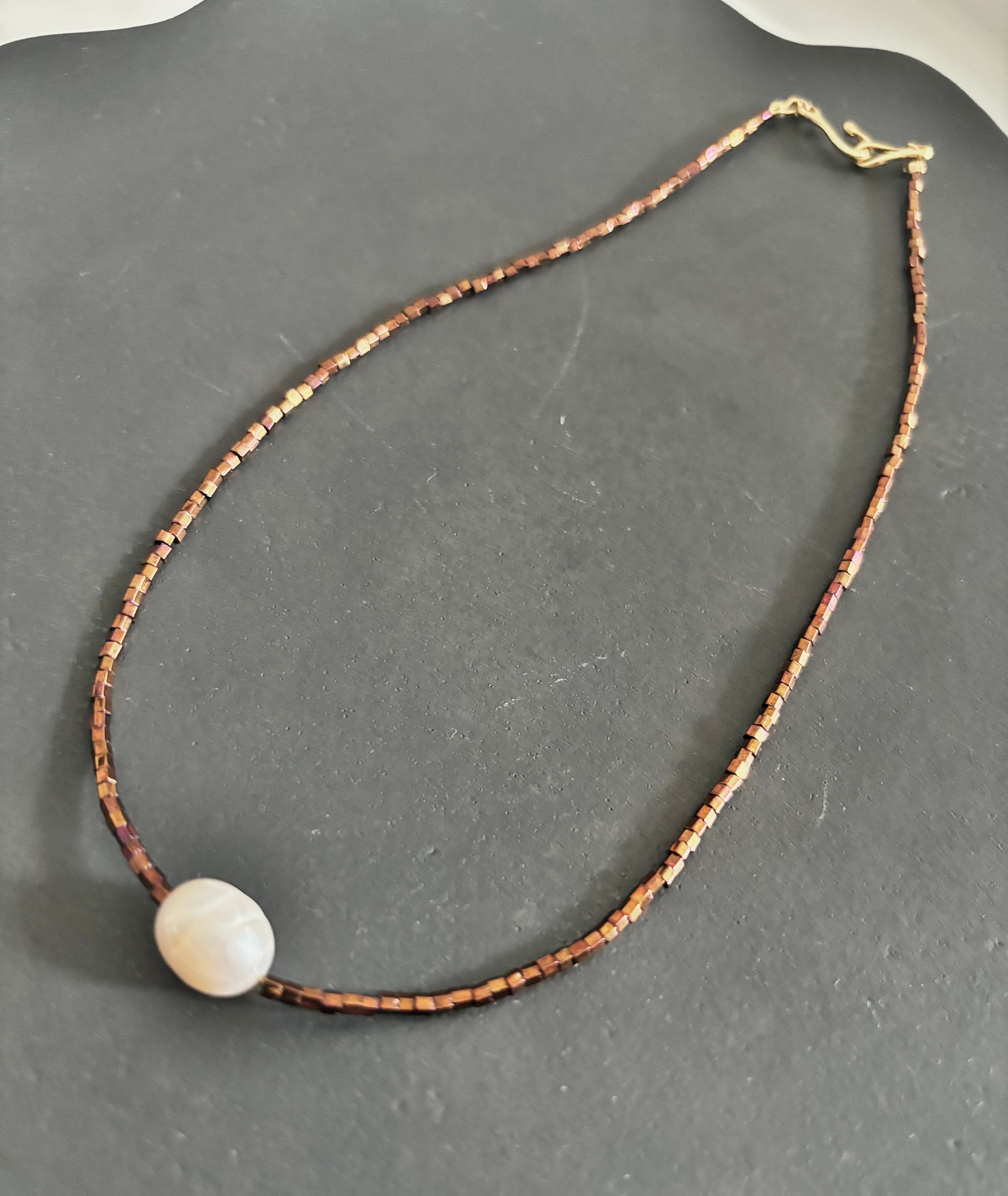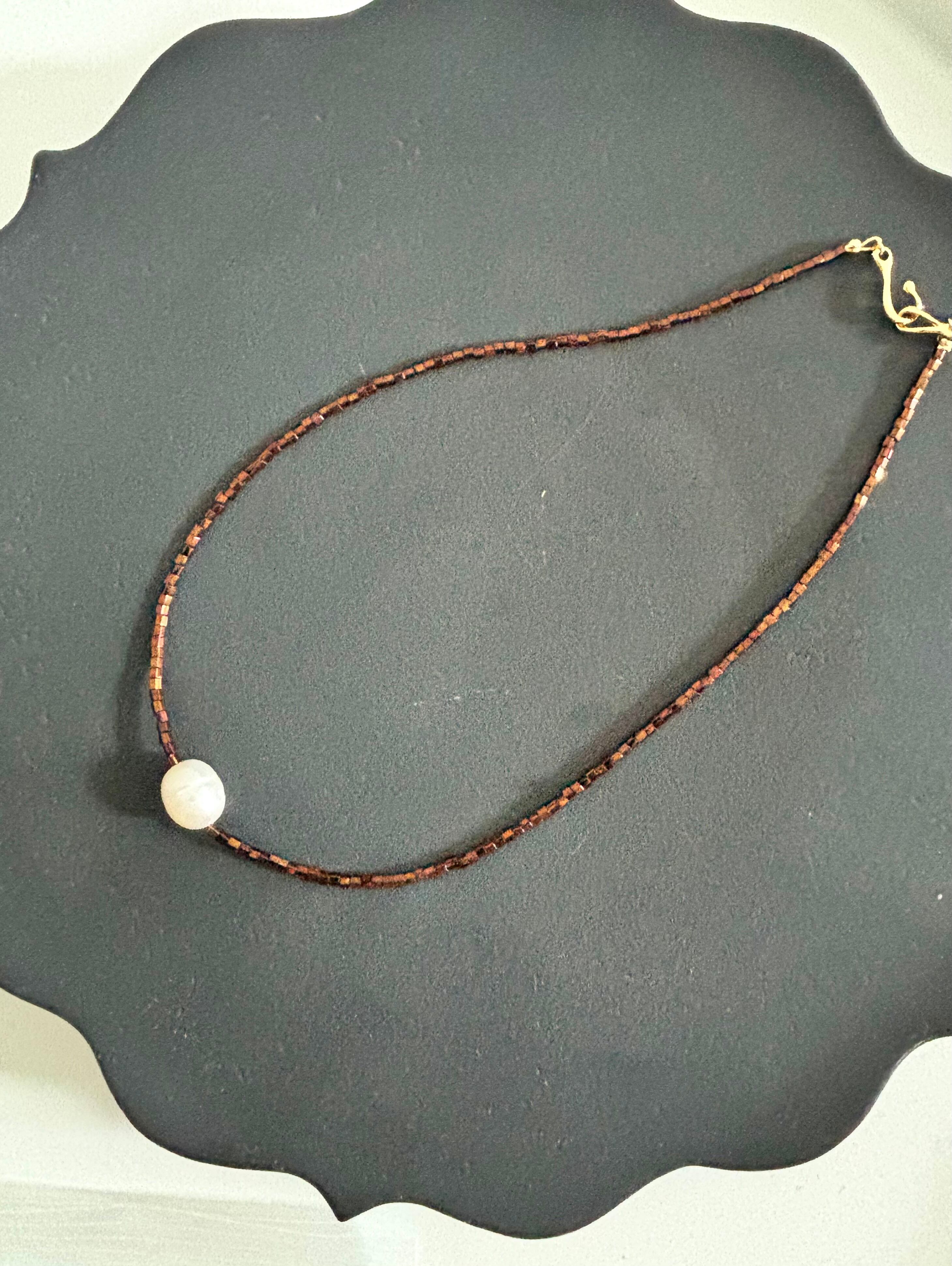 煌めく茶色のガラスビーズと大ぶりの淡水パールを組み合わせたシンプルでスタイリッシュなショートネックレス。普段の装いにアクセントを加えてくれるアイテムです。